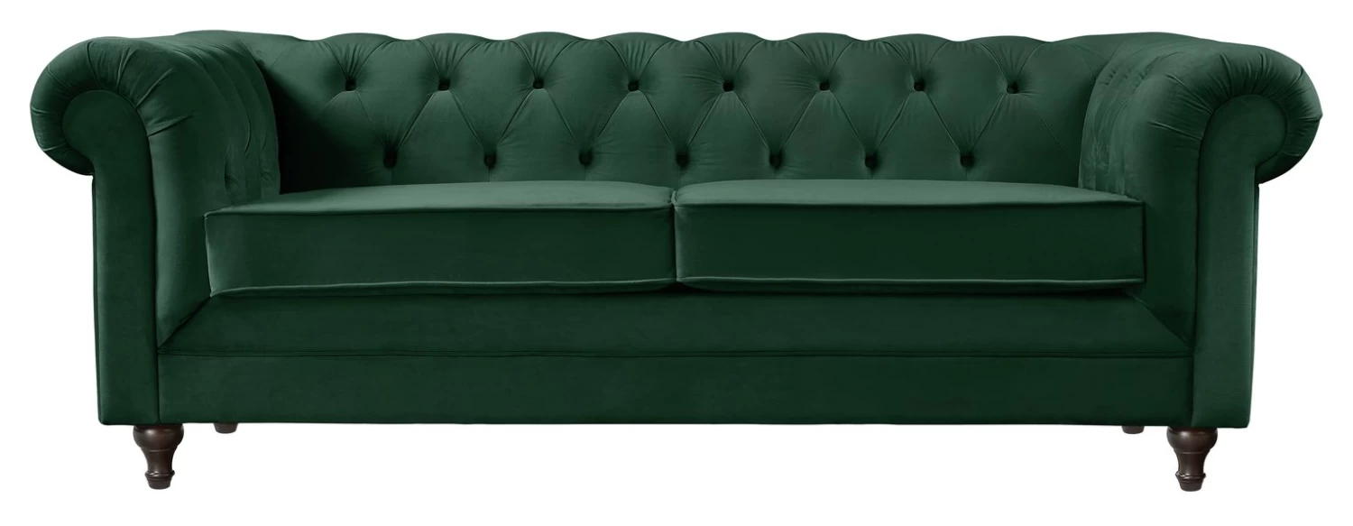 Incredibly iconic. Our Chesterfield sofa is full of character with its upholstered, low deep buttoned back and pleated scroll arm design. It brings a whole new wow factor to a room. Total accent piece in a luxurious velvet style. The split, foam-filled seat offers comfort and a perfect level of firmness to ensure this eye-catching stunner keeps its looks. Shapely, turned feet in solid wood are a final finishing flourish and lift it just off the floor to prevent any scuffing. Forever fashionable.