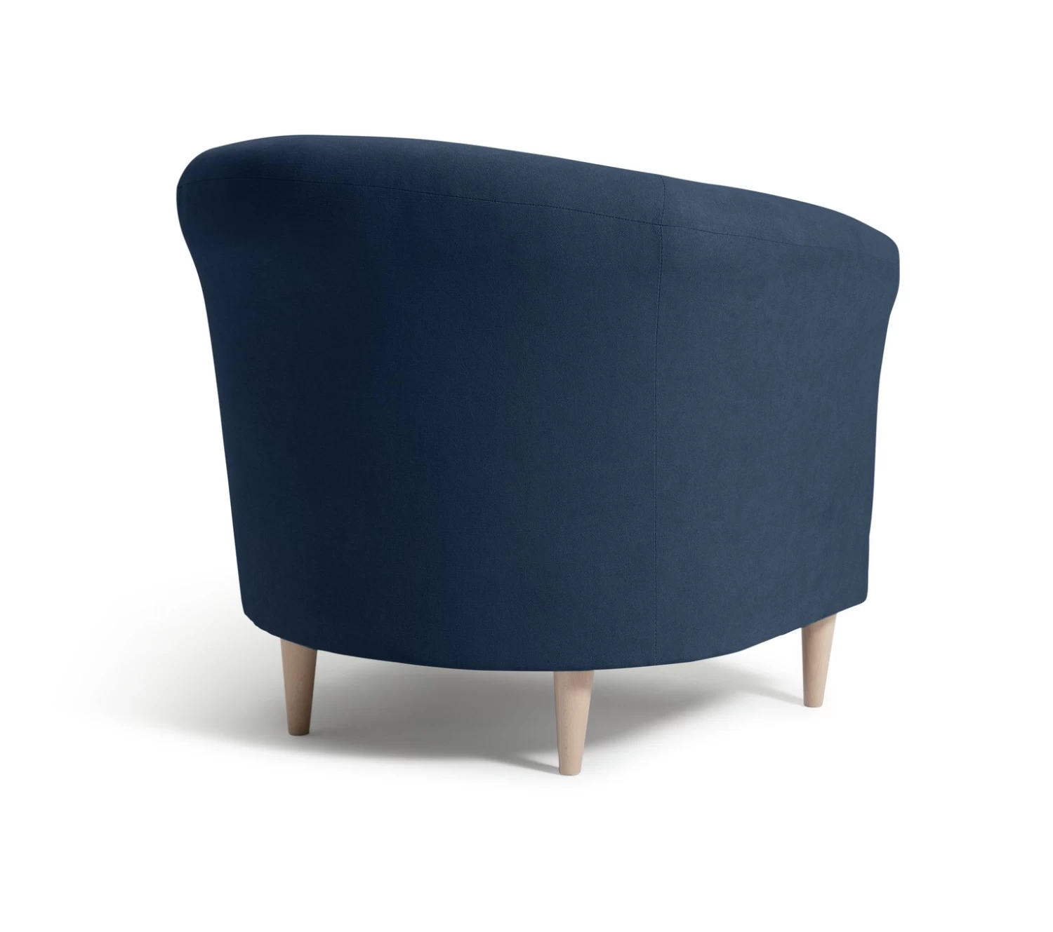 Sink into our navy tub chair. Soft, rounded edges welcome you like a big hug. With a curvy comfy frame and foam-filled cushions it's made to curl up on. And those tapered wooden feet give this shapely seat a modern edge. Make it your own with colourful cushions. Grab a book and a cuppa, you're sorted.