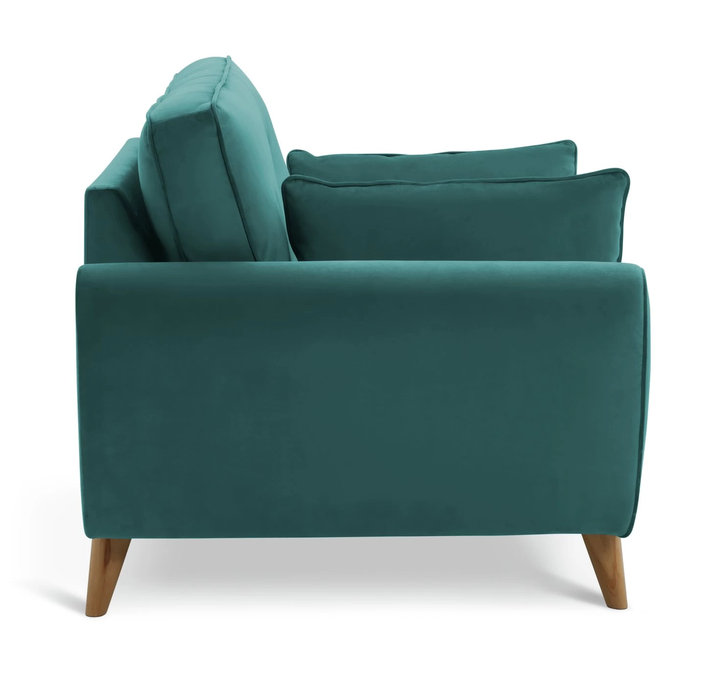 Retro chic. Upholstered in teal velvet, our Iris armchair features mid-century modern touches. Check out the clean curves, button back removable cushions and splayed beech wood legs. Relax into the comfy removable seat, arrange the 2 scatter cushions and settle in.