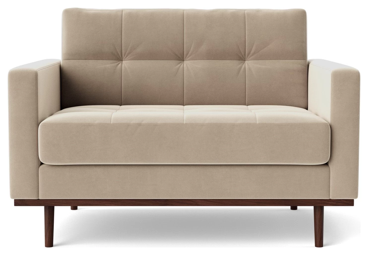 Falling over yourself to discover beautiful design? You'd better take a seat. A love seat. We were so struck by the Berlin when it arrived. In fact, we're still speechless . This is a larger version of the bestselling armchair, so even more space for tired feet and a stack of treats. Those clean lines, that tufting on the back, this is a Mid-Century marvel on legs – beech ones.